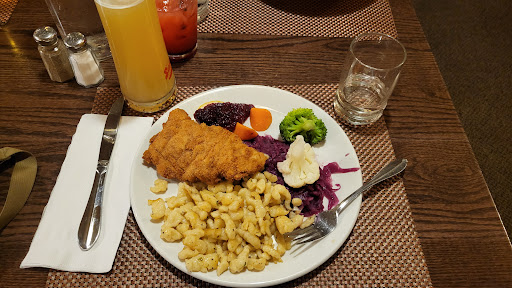 After a long day of bush-wackin through the lowlands of Boom Mountain I arrived here on the way back home. My new car squawking at me that perhaps it was time for a break. The Old Salazburg caught my eye and I pulled in. After a quick meet with the manager, my waitress Bailey was a delight. A charming personality, and a friendly smile made me feel welcome. I started with a classic for me in hot weather, Iced Tea. Walking about the place gave me the feel that it was a trapper cabin. The warm lighting with multiple balconies and plenty of sunlight had that cozy feel. Nevermind it's part of a Radium classic. And Radium itself is a nook in the rocks, and a really fantastic one at that! Several areas offered a variety of space, from a great patio, to a family room, some nice side tables for a romantic rendezvous to a private bar upstairs for a nice private function. The restaurant mimicked that highlight - a tasty stop on a travel through Kootenay Park. Wood and rock throughout, with many pieces of mountain life memorabilia. My dish was the Jagerrostbraten. Red cabbage, spaetzle and beef in a nice gravy with steamed veggies on the side. The red cabbage was okay, the spaetlze lacked nutmeg and was a bit eggy and no fresh parsley in it (I know, everybody likes it different 😉). The beef otoh was done superb with a mushroom and red wine reduction! Finished it off with a raspberry no-bake cheesecake, super yummy! It was pleasantly light and fluffy with real whipped cream.