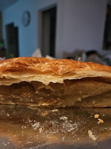 Concernant cette galette bien gonflĂ©e, nous avons Ă©tĂ© ravie de constater une belle garniture gĂ©nĂ©reuse quoique inĂ©gale. Les risques de la pĂątisserie artisanale, je suppose. La pĂąte feuilletĂ©e avait bon goĂ»t et elle nous a plu. Cependant, cette garniture d'amandes a complĂštement Ă©tĂ© Ă©clipsĂ© par un fort goĂ»t de...sucre. Les saveurs n'ont donc pas Ă©tĂ© totalement Ă la hauteur du look et de ce beau feuilletĂ©e. En toute franchise, cela n'a pas Ă©tĂ© la meilleure frangipane et galette que j'ai pu goĂ»ter, mais nous avons tout de mĂȘme passĂ© un bon moment "dĂ©gustation". La "fĂšve" Ă©tait ludique et amusante! Cependant! Pas de couronne! La tradition n'est donc pas entiĂšre!