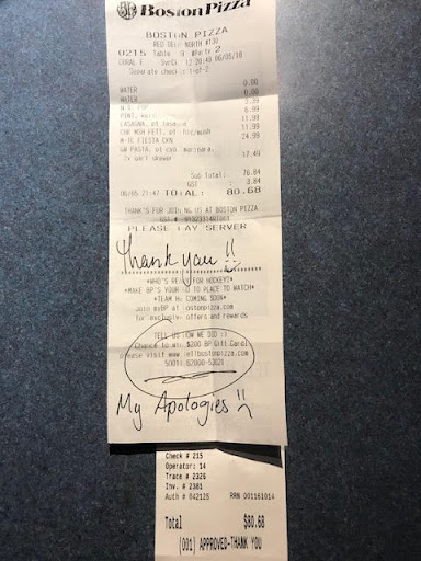 Not only has Boston Pizza North lost a hard working courier, but also a faithful customer. My family would go to that exact location for family gatherings whenever we were able to. I always found the staff there pleasant to deal with, until I had to deal with the management team and their complete lack of ability to professionally handle a small conflict.