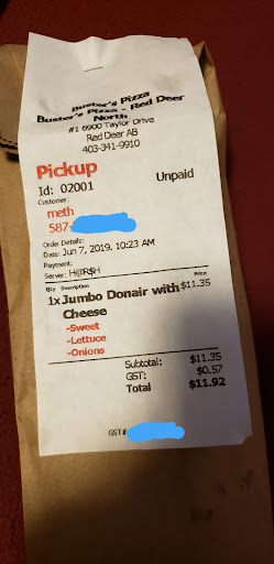 Read moreWas in to get a "Jumbo" Donair and cheese bread tonight. Very disappointed with the "Jumbo" size, smaller then other donair places regular size. Maybe Jumbo at Buster's means an extra piece of meat? And if you want extra anything expect to pay extra...a little extra onions or any other topping (lettuce, etc.) well it will cost you but you won't see a difference on the donair. The meat was mediocre and toppings were lacking. All in all the donair was a true disappointment. The cheese bread(sticks) and the sauces were actually very good. Lastly customer service at the Donlevy Avenue could use a little work. Guy at the front had very poor manners and could care less, had to give my name a handful of times then try my wife's name...he looked at me blankly....then without a word he just ran in the debit and left(debit machines need a no tip option). Returned with the food, left it at the far side of the cash register ripped off the debit receipt, didn't offer a receipt and left again. Walked over to the food he had placed on counter seen my name on it, only way I knew 100% that it was for me. Hate to say terrible service from this location. All in all not the greatest experience from a chain that should have this figured...