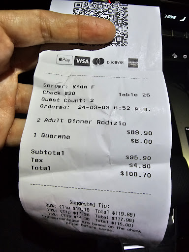 Read moreWe stopped at this place on our way back home from Edmonton to Calgary. To say I felt robbed is an understatement. We stopped by at 7PM on a Sunday. I understand they close at 8:30PM. The hostess was very nice, the server was as well. But I don't go to restaurants for the servers. The salad bar was ok. There was maybe enough rice for 3 portions and the rice was overcooked and undercooked (if you know how to cook brazilian rice, you know whoever cooked it put too much water at high heat to cook but ended up with raw chunks throughout). We got served a meat that look like beef Jerky. I asked the lady who was cutting the meat if she had anything that didn't look so much like beef jerky, and I asked if it was because it was the end of the day that we were being served meat that didn't look very appetizing . She said well , sort of , "see those people there ? They finished eating 30ish min ago, so yah!" But we can put some fresh meat for you but it will take a bit. I said no thanks, I'm sorry but their logistics issue should not be left for the customer to solve or give opinions on it. Not my problem. In summary, I paid $100 +tip for my daughter and I to eat 2 spoons of undercooked and overcooked rice, beets (they were good ), 1 tablespoon of farofa (there was barely any left when we got there ) and 3 pieces of super salty jerky looking like meat. No chicken was offered . Did I leave a tip? Yes, 10% . Why you ask? Because the server was super apologetic, one can say embarrassed and it is not her fault management think they can rip people off. I rarely post bad reviews but this was well asked for...