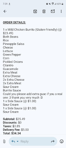 I ask them to use a parchment paper Instead of being accommodating, I was charged extra for this simple dietary necessity. I understand there may be additional costs for specific ingredients, but the lack of empathy and clarity about the charge left a bad impression. moreover I ask him to put guacamole but he charged me for 2x guacamole that’s unacceptable.