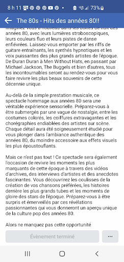 Nous sommes aller le 10 août pendant les ''année 80'', leur publicité mentionnait qui allais avoir des costumes colorés, des coiffures extravagantes, des chorégraphies endiablé sur scÚne, des vidéos d'artistes, des archives, des anecdotes etc...