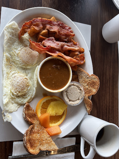 La bouffe : oeufs pas assez cuit. Trop gluant. Bacon trop cuit qui se désintègre en piquant avec la fourchette. Du bacon doit avoir un peu de tendreté tout en étant croustillant. Pas tout brun et sec. Fruit: 2 tranches très mince d'orange genre coupé à 2mm et 2 morceaux de cantaloup de 1.5 cm, bines tiède et patate sec.l et saucisse trop cuite à l'extérieur mais limite pas assez cuite à l'intérieur.