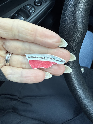 Read moreSérieusement, cela fait deux fois que je croise cette employée dans ce Tom Horton et les deux fois le service était de piètre qualité! Première fois: J'arrête au Tim uniquement pour le "déroule le rebords" car j'ai été trop longtemps une de leurs meilleures clientes..on m'indique (cette employée) que le verre choisit n'est plus dispo (nous sommes en début de concours)...ok cela est compréhensible mais elle a refusé de me donner un autre verre de peu importe le format (je rates donc une chance de gagner). Deuxième fois: Aujourd'hui j'apporte ce coupon (voir photo) afin d'obtenir mon café gratuit et elle m'indique que mon coupon est non valide car il n'a pas été découpé du pointiller au pointiller!!! Eufff mais c'est quoi cette blague??? Je lui demande si elle est sérieuse en indiquant que c'est bel et bien inscrit Win/Gagnez/Coffee/Cafe??? Elle n'a jamais voulu m'offrir gratuitement MON GAIN et même l'autre employée (probablement nouvelle) a trouvé cela ridicule! Je suis vraiment frustrée par cette dame qui en plus n'offre pas un accueil agréable ni aucunement courtois! Vous trouvez ça adéquat et/ou justifié? Je me questionne sérieusement que je n'ai même pas envie...