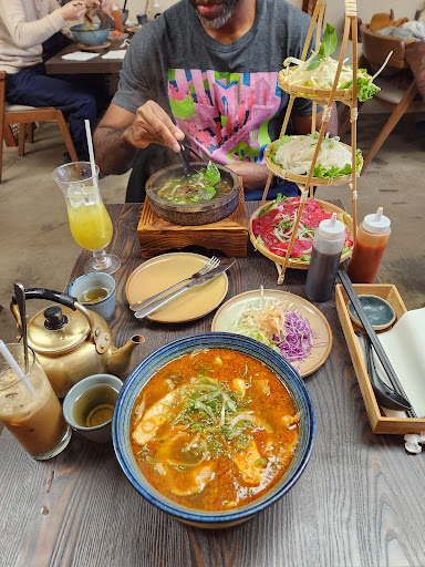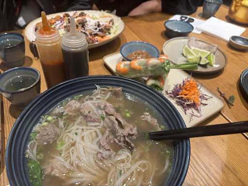 The pho broth is well seasoned, warming from the spices and not oily. The presentation of the beef bone in the stone pot and the pho ingredients on the side is an elevated experience. My partner finishes the full pho dish which is rare because most pho broth is too oily or salty to finish.
