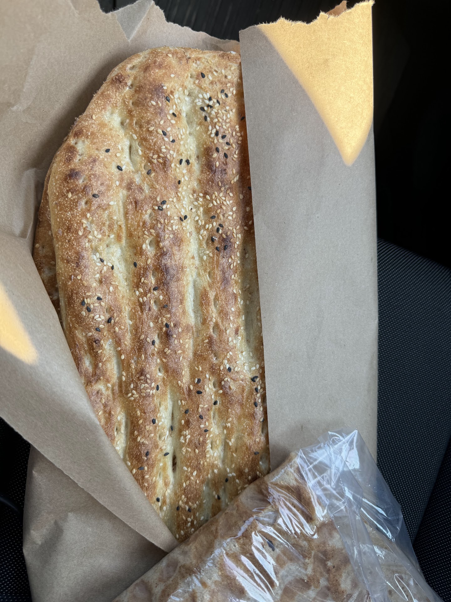 We walked in, not recognizing the bread on display, but it was fresh, huge, and being made right in front of us. We started with coffee, but then the (what I assume to be) owner suggested we try the massive round white bread sold in bags of three {taftoon}. Another loaf hanging up {sangak} caught our eye, so we ended up grabbing both. To our surprise, he even gifted us a third type—a long, narrow loaf {barbari} —out of sheer generosity. You could tell he genuinely wanted us to try his bread. Of course, as a business, you can’t just give away things all the time, but this gesture really showed his kindness and passion.