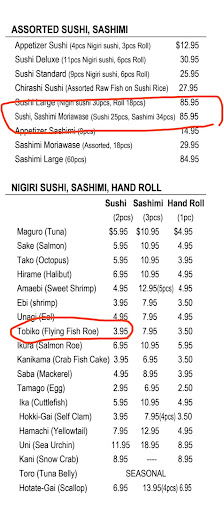 Firstly, I noticed that the charges exceeded the prices listed on the online menu. The sashimi moriawase was advertised at $85.95, yet we were charged $95.95. Additionally, the six pieces of toboki sushi were supposed to cost $3.95 each, totaling $11.85, but we were charged over $20 for them. After tax, it should be $110.51 but they charged $128.51 which overcharged by $18. My husband assisted with the pickup and was unaware of the total price. I only realized the discrepancies once he returned home.