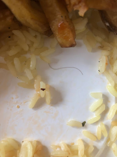 The pork and fries were so bad, I decided to eat the rice only. As I was eating the rice, I noticed a hair (see picture). On the verge of throwing up, I immediately stopped eating and was ready to throw away the meal. These things happen and I wasn't going to complain.