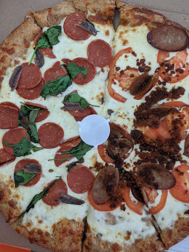 •base sauce ➡️ creamy garlic (they didn't charge extra for it back then 🥲) •LEFT: Plant-based pepperoni, spinach, and anchovirs •RIGHT: Plant-based chorizo crumble, tomatoes, and spicy italian sausage