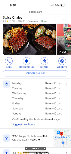 Read moreSwiss Chalet is one of my favorite restaurants. My daughter and I frequent either the Aurora or the Vaughan location at least once a week. Today while shopping at Hillcrest, decided to try the one in the plaza. It was absolutely the worst we have ever had. My daughter had the rib meal. After waiting almost 30 minutes, we were shocked and disappointed at both the portion sizes and the cook. My daughters ribs were stone cold. I got up and went to get the server to tell her. She came and scooped up the cold ribs and about 10 minutes later a gentleman (not sure if it was the manager) brought out a new rack. My daughter took a bite and said she could not eat it as it tasted rotten. I tried a small corner and found the meat tasted old, perhaps from the day before, just reheated. She left the rest of rib after eating only one small corner. We both told the server and the Manager that she could not eat the ribs as they tasted old and flavorless. The server said "oh sorry". We received a full bill for the food, no discount for the rotten ribs. I did not complain because I was looking for a discount, but feel we should have been offered another meal as her food was barely touched. My daugther and I had to go into the mall to get something to eat for her.