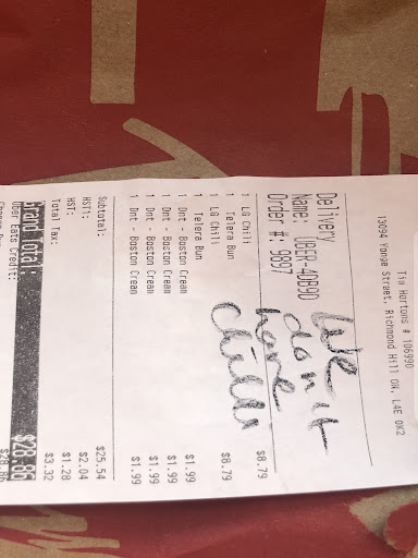 Read moreWould recommend go to the other location 800 meters away from this location. Waited for half hour after placing mobile order. I found the staff missed few item, including drink and 10 timbits. but the staff didnât tell me. Until I went back to cashier, they admitted that they replaced 10 Timbits with one donut. They never informed me about this replacement nor provided refund until I asked. A box of 10 timbits is $2.99 + tax while one donut is just $1.29 + tax. Management of order is completely messed up. if I didnât check on site, I would have been charged...