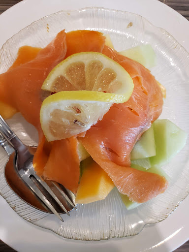 We also ordered an appetizer - smoke salmon with fruit salad. I assumed a fruit salad would come as canned fruit mixed with mayo like at all HK style restaurants. This place was just honeydew and cantaulope. It was gross. Almost $10 for 2 pieces of smoke salmon and melons.