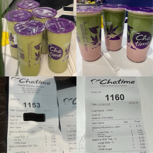 There is a noticeable difference between the Cha Time experience at Blundell Road and the one at Richmond Centre. At the Blundell Road location, we ordered a large Matcha Strawberry Latte with no ice and 100% sugar. We are frequent customers and always order this specific drink with these instructions. We've consistently observed the strawberry component visibly settled at the bottom of the cup. However, tonight's experience was significantly different and unpleasant. The cashier who served us was exceptionally rude. I politely inquired why the drink lacked the visible strawberry layer, as my youngest daughter enjoys seeing the distinct color separation. The cashier repeatedly insisted she had done nothing wrong. I clarified that I wasn't accusing her of wrongdoing, but simply pointing out the discrepancy. I had witnessed them adding the strawberry to three of the cups, but the fourth appeared to be made with insufficient ingredients. I observed them discussing adding more water to compensate. In short, I expressed my dissatisfaction. The cashier refused to remake the drink or offer a replacement, instead arguing that she had done nothing wrong and saw no reason to do so. I explained that we were unhappy with the product, as it did not match our previous experiences or the advertised presentation. Cha Time is not inexpensive, and we expected to enjoy our purchase. After returning our money, the cashier told us not to return to the store, without offering any apology for the poor customer service. I requested to speak with a manager to escalate the issue. Unfortunately, the cashier identified herself as the manager named Joy and colleague named Caroline. We left, unwilling to waste further time with an unhelpful and rude individual in a supposed management position. We then went to the Cha Time at Richmond Centre. (Please refer to the attached picture and receipt for comparison.) The drinks were exactly the same order. You can decide if my complaint was justified, or if the cashier/manager at Blundell Road was justified in telling us not to return. In contrast, I want to commend the Cha Time at Richmond Centre. They prepared our order correctly, were exceptionally friendly and helpful, and proactively explained the process for placing...
