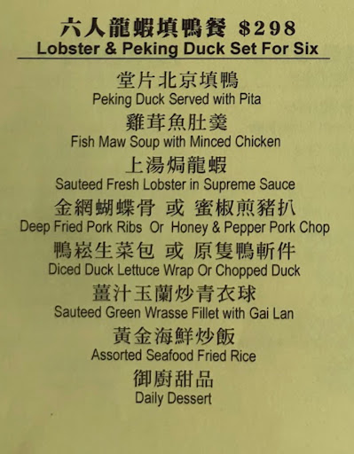 Took my family here for my dad’s birthday dinner and ordered Lobster & Peking Duck Set for 6 along with two other dishes. I had asked to substitute the Seafood Fried Rice to just regular/any meat fried rice since my little brother was allergic to shrimp. The general manager, Lawrence had said “ok” and even suggested BBQ Pork Fried rice. When we received the food, it happened to be Seafood fried rice and before the other lady manager served us, I stopped her and clarified our order. The General manager came back and said “kitchen was busy, I’ll give you this one for free and order another bbq rice since it will be awhile. It was my mistake.” After seeing my bill, they had charged us extra dish for the rice and when I went back to get it fixed, the general manager tried to reason with me that I didn’t hear him properly and that his “English was wrong”. What sense does it make ordering two big plates of rice? After trying to explain the multiple times, I finally gave up because although he kept apologizing, I felt as if he was trying to brush off the fact that he messed up our order. He tried to offer a free dish for another time(not the same day) but at that point i was already annoyed and declined. However, I lost my patience when he tried to reason that the almond COOKIES (yes only some cheap cookies) which was supposed to be part of the dessert set menu anyways was on the house…. LOL WHAT A JOKE 👎🏼 regret booking here 🤣 nonetheless, other servers were kind, but food overall salty. Don’t think I’ll be...