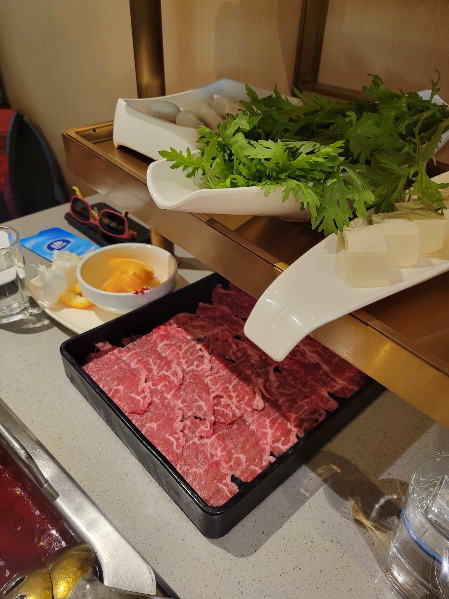 The other problem about this is that when I have hot pot, I like to have a bit of everything. Not just a plate of beef. So, with sides this large, unless you're with a bigger party or you have an incredible appetite, there just isn't room for a little of everything. It's not possible. And considering most tables we're couples, not families or big friend groups, it's too bad they don't have a "half" option for all their sides.