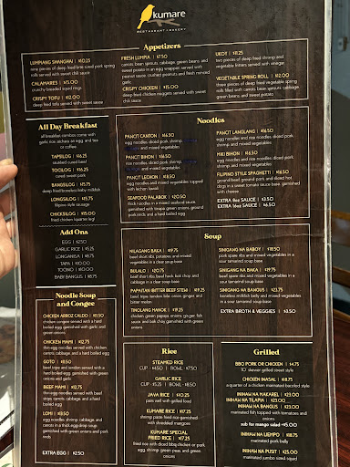 Overview Kumare Restaurant and Bakery offers a taste of authentic Filipino cuisine with traditional dishes that highlight the rich flavors of the Philippines. Located in a cozy setting, this eatery combines a bakery and restaurant, catering to guests with a range of savory and sweet options.