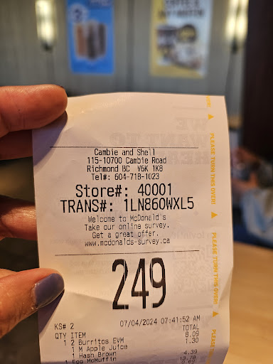 Read moreNo problem with the cashier taking orders. It was the one whose preparing the order. It was a hard day for us as my Aunt pick up Uncle from a doctors appointment and no time to make for food and decided to just order McDo at Cambie and Shell Road, Richmond. Unfortunately, when we got home.. check the bag and missing 2 of our order. Aunt called McDo and speak to a manager and just said came out from his meeting blah blah and said that apologized about what happen and said manager that he will communicate with the front desk to arrange a pick up for the missing order. My aunt told the manager to just send nephew and just mention about missing order to the window booth and they will know. It was tight this day for me as I picked a family from clinic knowing that We won’t do cooking much.. Was frustrated and feeling so angry as when your hungry and needed to eat someone. Because of trust and thinking that as a worker.. we always carry a big part of A in everything we do. Send my nephew and didn’t happen what the manager said to my Aunt, and the front cash at the MCDo store needed my Aunt to go personally and picked the missing orders, that’s ridiculous, meaning that the Manager whom my Aunt spoke with didn’t communicate what was agreed upon. How can they forget a chocolate milk and a chicken crispy wrap to put in the paper bag. Should be the food dispatch to make sure it’s everything...