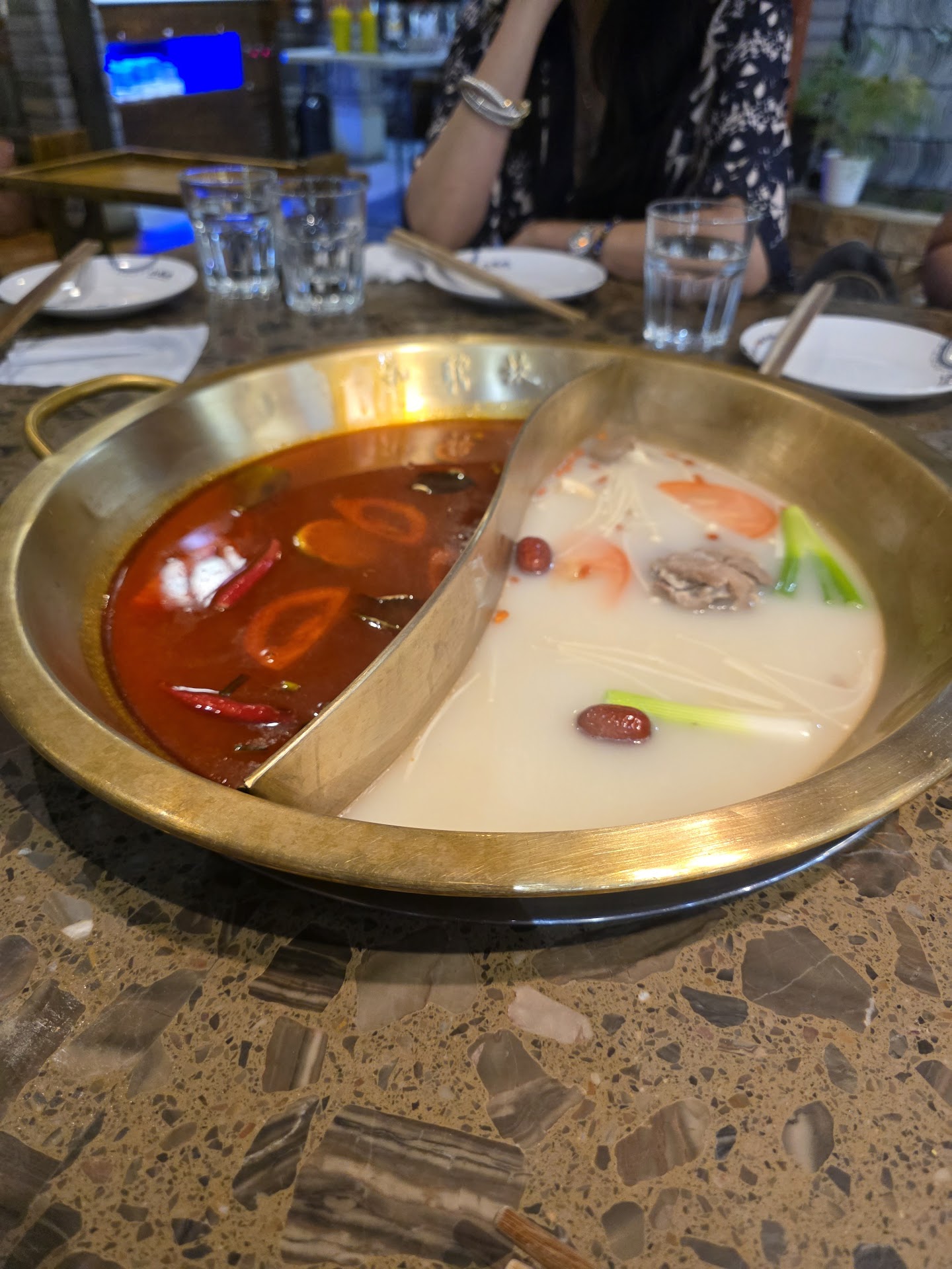 Read moreFood was good, especially the spicy soup base,but services could be a lot better. After ordering food through their website using the QR code we wanted to add 2 more beers. After our food had come and we were mid say through my mom realized the beers hasn't come yet, so we asked a server for help ( it actually told us quite a while before we were able to get a server's attention), he said he will go check for us, but never came back. So we had to find another server, she promptly checked our orders, and told us she will be bringing the 2 beers over, and she did. Around 8:30 PM (our reservations were at 630 pm but we were seated until around 645 to 650) we were told there were others waiting and if they could clear the table (we we all mid eating fruits to end our meal at this point). We said sure thinking he will only be clearing our plates. He then proceeds to dump our remaining sauce and contents from our bowls into the hotpot infront of us and some spicy soup base actually splashed out on to the table and on my clothes. Everything was done very roughly and clumsy making us all feel uncomfortable. The sauce bar was messy and often empty. Having experienced hotpot at Hai De Lao and Dolar hotpot, we were extremely disappointed with the service at...