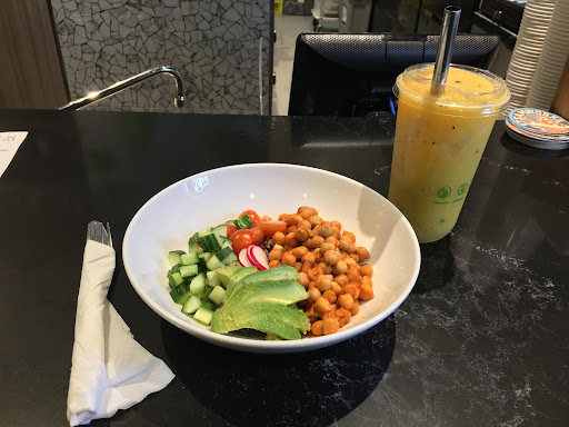 The setup here is split between a grab and go counter with sandwiches and salads, baked goods, coffee, and bubble tea, and on the other side, a small bar where you can order alcoholic drinks, restaurant food, and any of the drinks from the coffee/bubble tea bar. I think they're supposed to close at 9, which is annoyingly too early for most red-eye flights, but I've sometimes seen them shuttered even earlier. I stopped by the grab and go counter a few years ago and got a fresh milk with grass jelly. It's hard to miss up a simple drink like that and theirs was good with lots of grass jelly. This time I sat at the bar to order dinner. I tried the buddha bowl and a mango passion fruit slush. The buddha bowl was a little weird; the individual components were all good, but I didn't think the masala chickpeas (DELICIOUS on their own) went well with the large-chopped raw vegetables or the wild rice blend - the vegetables cancelled out the slight sweetness of the chickpeas, and the spiced chickpeas covered up the nuance of the wild rice. The mango passion fruit slush was icier than I expected - I watched the barista make it, and it was juice + ice - no blended fruit. But I guess it's a slush, not a smoothie, so I just set my expectations wrong. It was fine even though it wasn't what I really wanted. Airport prices = roughly $30 before tip for the food and drink. Oh well. I would consider getting dinner here again and trying something else like...