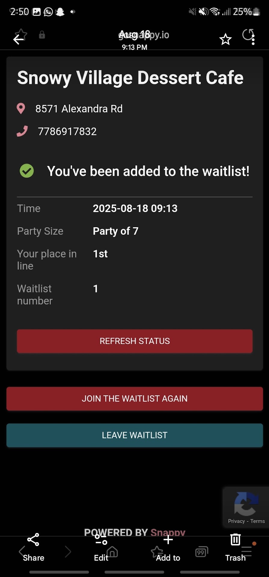 A couple of weeks ago I put my name down on the waitlist using the QR code at the front for a table of 7 at 9:13pm.