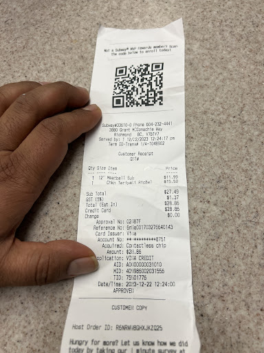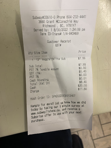 When i get to my table, i find that she also did not provide me the receipt for the second sub, she then said she did, fine!