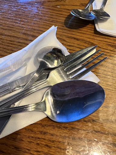 A couple new set of silverware were brought to us. When I opened the wrapping napkin, the dry food from previous customers were stocked to the spoon.