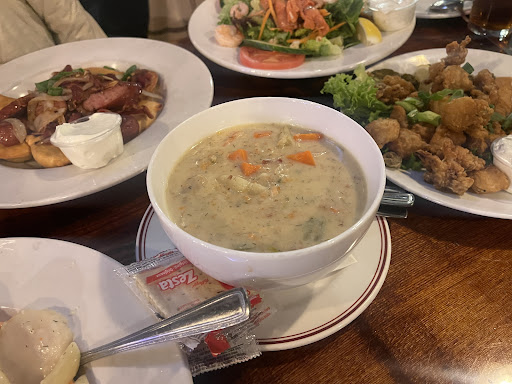 The daily homemade soup was rich and comforting, while the fried calamari was tasty, though the overall flavors were just average.