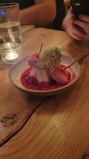 Read moreInégale. Nous avions réservé des mois d’avance avec beaucoup d’attente. Une fois sur place, petite table dans le resto près de la cuisine. Tout le monde mange la même chose , ce qui est une bonne idée pour optimiser le travail. Le service est efficace malgré le fait que le resto soit plein. À ce prix, je m’attend à ne pas avoir d’erreur, mais on dirait que j’étais dans l’expérimentation des recettes. Les mises en bouches de fleurs de courgettes étaient légères , non grasse, le faux caviar de moutarde à l’encre de seiche génial. Ensuite, le thon à inspiration asiatique était bon, mais pas wow, beaucoup trop d’éléments pour rien et très grosse portion. Le risotto n’avait que l’apparence. Très joli et surprenant dans sa présentation, mais juste un jus vert insipide avec une brunoise de chou-rave cru. Ce dernier aurait eu intérêt à être blanchi. Le plat de pâte était le pire de la soirée, une présentation plutôt « plate », une sauce tomate lacto-fermentée tellement acide, que même le fromage crémeux de la farce n’arrivait pas à balancer. Le poulet aux morilles et vin jaune fut le clou de la soirée, servi en une croûte de sel pour l’ensemble des convives, une très belle maîtrise de cuisson et de goût, bravo! Portion énorme. Nous avons goûté un dessert sur deux, car nous n’avions plus faim. La ganache au chocolat était sublime, du velours savamment exécutée. L’ambiance était très bruyante et avait l’air d’un party du jour de l’an à la fin de la soirée. C’était une bonne idée d’expliquer les plats et la provenance des produits, mais peut-être pas de sortir les les lunettes, perruques, pianiste de jazz progressif, shooters, champagne…c’était la confusion. Je suis heureux d’y avoir été, mais je ne crois pas...
