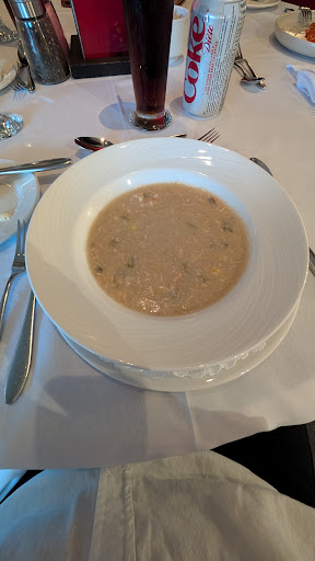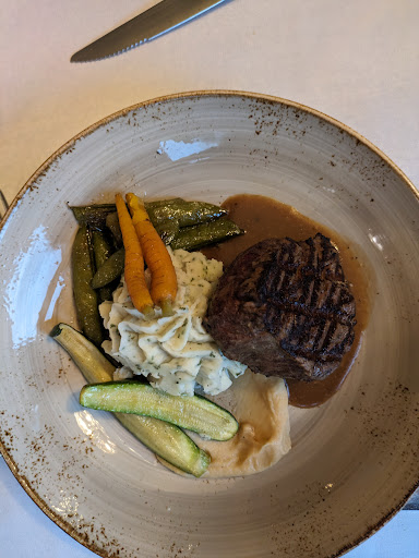 Restaurant qui hélas ne mérite pas ses 5 étoiles actuelles sur google. Même si le repas est correct dans son ensemble, le restaurant ne mérite pas de figurer dans la section "gastronomique" du guide de rivière du loup. Le repas était convenable: tomates (qui manquaient de maturité) en entrée, carré de veau en plat (serveur ne pouvant pas me donner l'origine exacte de la viande, et les condiments plutôt fade) et dessert sous la forme de banquet à priori que je soupçonne de dessert industriels. Côté vin pas de présentation de la bouteille avant de servir le verre on ne sais pas ce que l'on boit... Pour le service, serveurs plutôt agréables notamment les apprentis, pour les plus ancien on se sert directement au buffet des desserts pour grignoter à plusieurs reprises sous mes yeux ébahis. Dans l'ensemble cela manquait de professioalisme, je n'aime pas laisser de mauvais commentaires mais au prix de l'addition (113$cad/pers hors tips, avec taxes) nous attendons un repas et un service de très bonne qualité. Je met donc 2/5, je n'ai pas mal mangé mais j'ai mangé pour bien en dessous du prix que j'ai payé et je pense que le standing annoncé par le restaurant n'ai pas atteint ne méritant...