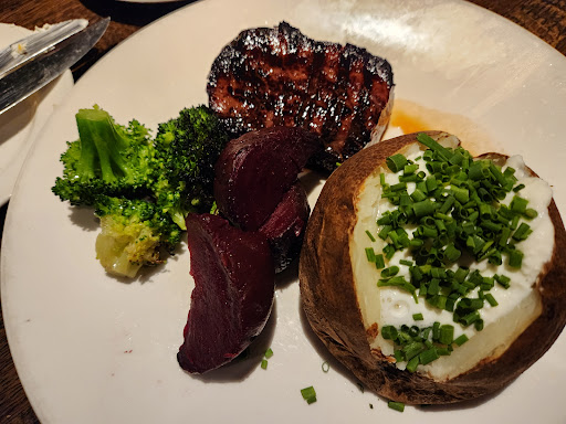 The hubs got the Billy miner pie for dessert as well, with a wedge salad as the appy, and the filet mignon as the main (with fries). Now he had a great meal; he enjoyed the filet (tender, tasty, cooked exactly as he wanted), had no regrets about choosing the Billy miner pie instead of the coffee dessert, and the wedge salad he considered a success because they didn't skimp on the blue cheese. I did have a taste of the wedge salad and concur that the blue cheese went well with the iceberg lettuce (usually I'm not a fan of iceberg).
