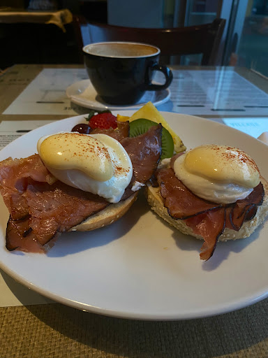 Read moreHad a good brunch here! The place was smaller than I expected and they were predictably pretty busy when we arrived around 11:30 on Sunday. Indoor seating was full, but we got a table for 2 right away on the patio. It was awful weather, but the patio is covered and heated, so it was actually fine. My food and drink were really good! I got a strawberry matcha latte and the Mt Doug benny. The matcha was good and the strawberry wasn't too sweet. It came with a little biscotto, which was a treat both to dip in the drink and eat on its own. The benny was delicious - all the toppings went well together and the pesto was great. The latke base was interesting. I liked the latkes but I would probably get the bagel base if I could do it over again for a little less oil. I thought I ordered half salad/half fruit for my side, but I got fruit and potatoes. Didn’t feel like sending it back. It was a lot of potato, but the side potatoes were admittedly really good with lots of seasoning. Our waiter was attentive and very friendly. They asked us to move over a table at one point before we even got our food so they could accommodate a bigger group, and it was no big deal for us, but they were nice enough to comp our...