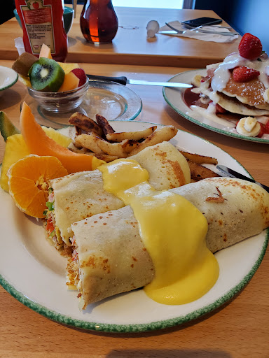 been to many Cora's all over and I've got to say this is the only one I did not enjoy. at first the waiter who greeted us and sat us was nice and friendly but after she brought us to our table I guess her shift was done and 2 or 3 other waiters dealt with us. I don't know if it was because we were english, or if they just didn't care about good service. now, the place was not busy at all, maybe 3 or 4 other tables had customers so business wasn't an excuse. we weren't offered a chair for our 1 year old, had to go look for one after a wait to see if they'd even offer. the fruit, usually good and well presented at Cora's, was the worst I've ever seen in quality and presentation. we had to ask for multiple things they forgot to bring to our table, they never came back and asked if everything was ok, we had to call them over each time for toast (they burnt it, but we just scraped off the black cause we didn't want to bug them anymore), syrup for the pancakes, jams, smoothie, water, straws so the kids could drink the water and we had to take cutlery from another table. I still tipped 18% even though it was one of the worst dining experiences I've ever had.. they deserved nothing, but if the bad service was a because we were english and they didn't care about us for that reason, i wanted to show that we were decent people even though they weren't...