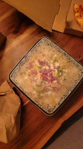 Petty critique is simply that the garlic bread is a ciabatta, split in half, with butter, some garlic and what is probably parsley. Not sure Iâd have paid 6$ for that again but for how tasty the pasta was I can get over that easily. I get they had to put someone to put it in the oven and prep it so I think if youâre reading this considering garlic bread but donât want to pay 6$, you can always make a quickie garlic bread at home in a convection oven or melt some butter with parsley and minced garlic, brush it over a freshly toasted bread thatâs still warm and youâll have it all