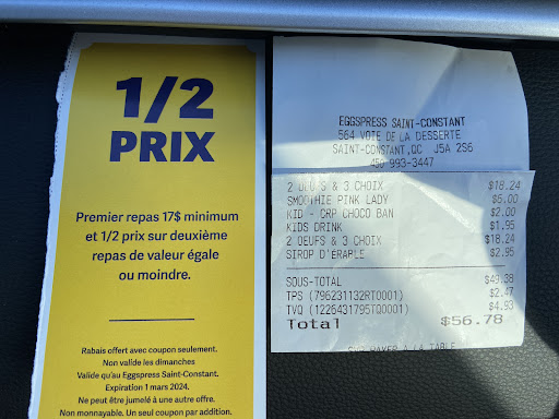 Read moreMa famille de 5 (3 enfants de 5,6 et 7ans) +invitĂ©s, allons Ă lâEggspress de Saint-Constant, depuis son ouverture, et ce hebdomadairement, jusquâĂ tout rĂ©cemment. En soit, nous avions trouvĂ© notre restaurant-dĂ©jeuners de prĂ©dilection - les enfants y mangeaient gratuitement les dimanches, les assiettes Ă©taient bien garnies, dĂ©licieuses et chaudes Ă souhait, avec de beaux fruits, des fĂšves au lard savoureuses, des muffins-anglais moelleux, le bacon de qualitĂ© cuit Ă point, le cafĂ© Ă volontĂ© en cruche... Nous y sommes retournĂ©s 2 fois aprĂšs le 31 juillet 2019. Depuis ce jour, les enfants ne mangent non seulement plus gratuitement, mais ils nâont plus aucun fruit dans lâassiette (sauf 1 petite tranche de melon du jour). La crĂȘpe-pĂ©pites-choco est TRĂS ordinaire pour 7,50$: 1 crĂȘpe avec une 20aine de Chipits, pas de fruit, rien Ă boire. Dâailleurs, les boissons-enfant nous sont chargĂ©es pour 2$ dâextra, sur un prix dĂ©jĂ exagĂ©rĂ©, Ă mon avis. Un mini bol de fruits, bananes noircies incluses, pour les enfants (puisque les assiettes sont rendues maigres), mâest arrivĂ© la grosseur dâun bol de bines (elles-mĂȘmes rendues fades et froides), pour 3$ de plus aussi. Les muffins-anglais ont perdus leur moelleux, sont secs, et ne vous faites surtout pas berner - 1 oeuf bĂ©nĂ© ou 2 dans lâassiette, câest le mĂȘme prix!!! Le bacon, sâil nâest pas mince comme du papier, vous arrive calcinĂ©. Le cafĂ© se fait rare, on en a au moins juste 1 fois, et plus de cruches self-serve... Le personnel Ă©tait jadis sympathique, chaleureux et courtois, maintenant ils vous assurent que les portions ne sont pas diminuĂ©es (yeah right), et doivent vous balancer tous les extras Ă dĂ©bourser en plus sur votre facture... Au final, tous les ânananesâ qui rendaient cet endroit exceptionnel, comparativement aux autres restaurants-dĂ©jeuners du coin, nous ont Ă©tĂ© retirĂ©s en peu de temps, ce qui nous laisse amĂšrement déçus. Eggspress est devenu aussi ordinaire que le Tutti-Frutti dâavant.... La cerise sur le sundae, leurs prix ont augmentĂ©s, mais la qualitĂ© a drastiquement chutĂ©e! Câest vraiment dommage, nous voulions tous tellement garder nos meetings-famille hebdomadaires chez vous! Vous pouvez garder votre 10% de rabais en Ă©change dâune critique, nous ne...