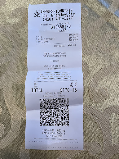 Read moreMy husband and I were very impressed with this restaurant from the moment we stepped foot inside. It’s a family owned business, which the owners and family members are hands-on. That certainly gives it a personalized touch! We were received with a very friendly and warm greeting. The menu is not big, so you know that you’re getting fresh and delicious ingredients, however, it’s big enough with a nice variety of dishes that it will still make your choice decision a dilemma. But whatever you decide on, you cannot go wrong because it’s all Delish! Plus, the wonderful people there will definitely help guide you to your perfect choices. The service was impeccable! The setup and atmosphere is wonderful, spacious, airy and very relaxing. They have various seating sections, including a cozy outdoor terrace. All areas of the restaurant have lots of space between tables and beautifully set the way a dinner table should be…with real linens. They have a fantastic wine cellar that I would love to have in my home! The washrooms are Super Clean and very spacious. Also, not to worry about parking because they have a great size parking lot. Last but not least, even their name, “L’Impressionniste”, has a special appeal to it, that made it intriguing for us to give it a try. End results; Absolutely No Regrets & we are Definitely...