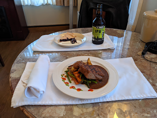 Room service from a lovely lady at front of restaurant. Quebec pork dinner with local wild blueberry pie and creme fraiche . La Chouape organic IPA strong ale brewed in St. Felicien, full bodied drink. Makes for an exceptional evening in.