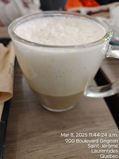This is a cafe in the busy shopping centre Carrefour du Nord of St. Jerome. They have nice seating inside and tabels in the shopping alleyway across from the dollar store. The variety of coffees served is good. There are little baked desserts as well as salads and sandwiches. There is no table service, but they did offer me help. Shoppers in this center favour this location for a tasty quiet repast, and...