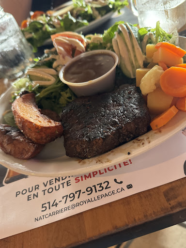 Read moreÇa semblait intéressant de l’extérieur, nous y sommes aller. À l’intérieur c’était beau, un petit village Country. Il y avait beaucoup de table de libre ce midi, je rentre avec mon mari et on nous dit de se choisir une place à deux n’importe où. Nous voulions être près d’une fenêtre 🪟 , alors on a choisi une table près de la fenêtre. Mais la serveuse nous a crier dessus ‘NON JAI DIT UNE TABLE À DEUX’. Alors on dit Ok sans trop comprendre puisque le resto était presque vide. J’ai dit à mon chum qu’on allait aller ailleurs, j’étais gêner que tout le monde nous regarde après qu’elle nous a crier dessus. Mon chum a préféré essayer il a dit laissons lui une chance. La serveuse reviens nous voir à notre petite table de deux au fond du resto, nous dit que si elle commence à dire oui à 1 après les autres vont faire pareil. On se dit que Ok, c’est leur politique peut être elle a juste été maladroite et impolie… Elle arrive pour prendre notre commande on lui demande c’est quoi le steak pirate. ? Elle nous dit que ces leur spécialité, TRÈS tendre et succulent. Vue le faible prix on était étonné, coudonc ! On va goûter leur spécialité! L’assiette était belle, bien monter ! :) C’est arriver très vite, la cuisson était bonne. PAR contre. Le steak était veineux, pleins de tirailles. Mon mari a des dents de carnivores, et il a pas pus manger on aurait crue que c’était de la gomme à mâcher, vraiment écœurant les grosses veines qui sortait de partout. Le goût est pourtant divin ! Les légumes étaient fades, il manquait cruellement de sauce à salade 🥗 Même si la sauce était délicieuse. Au final, avec 2 bière et 2 desserts plus pourboire ça coûter 70$ ce qui est très raisonnable vue la piètre qualité de nourriture servie. Nous pensions arriver dans un bon resto avec de la bonne bouffe finalement on s’est fait avoir avec une serveuse impolie et leur spécialité veineuse :/