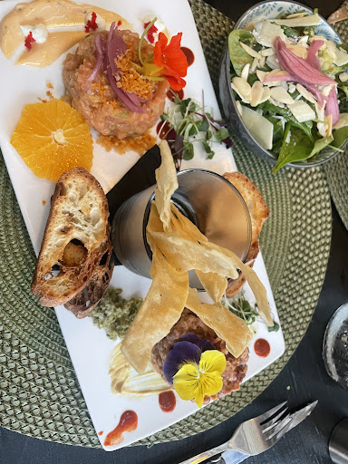 Assiette de mon conjoint: duo de tartare Le saumon ne goûtait pas du tout tant les ingrédients étaient trop présents en bouche. Et le tartare de boeuf sentait et goûtait vraiment que les câpres (qui quand c'est trop prononcé ça sent le gaz à briquet). Merci d'avoir chargé un entrée de tartare au lieu du duo.