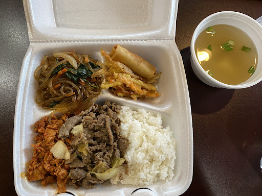I got half spicy pork bulgogi and half beef bulgogi special combo! It comes with Korean style potato soup, sweet potato noodle, a piece of spring roll and a piece of pan fried vege. Man! I love this combo since i can sample everything at once!