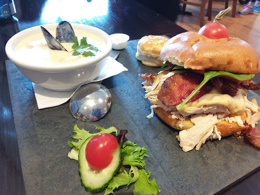 On a bike trip, after a swim in the lake, I stopped at this place around 10:30. The outside terrace is great, the inside looks bleak like a retirement home. Staff of early-twenties makeup girls, a bit aloof to the people, avoiding eye contact, acting the motions enough so they can claim a check and get back to their instagram life. Every sentence from them feels like itâs told the same way to everyone. In the kitchen, young dudes looking like they donât really care. Pretty much everything on the menu is between 21.99 and 23.99. No breakfast options. There are specials of the day, but at the same price as the rest. Ended up taking a bacon and mushroom burger that should have been 15$, but was 24. Arrived opened on the plate, in two piles, old trick to make you feel like the plate is better filled than it really is. Some fries. Nothing else. Just okay, not impressive, the patty was dripping itâs cooking juices all over my plate. I suspect the bacon was precooked, was dry, thin and flavorless. I asked for mayo for the fries and they wanted 1$ surcharge so I refused, feeling I was already paying enough. I had coffee too, average drip coffee, not good, in a mug that smelled of dishwashing soap. The music was also very annoying, a soulless collection of 70s and 80s radio hits weâve all heard too many times already, played too loud for the mood of the place. As soon as I was finished, the server rushed me into paying my bill, asking how Iâd pay as she was already pushing buttons on her machine, not a single look at me. In the end the bill was a few cents short of 30$. Thatâs a lot for what I got. Paid with 40$, and the server asked me if I wanted the change, hinting that I should leave the remaining 10 as tips. Oh yes I do want the change. Do I recommend it? No, not at all. Lacks pride, honesty, effort, and respect for their clients. Left feeling...