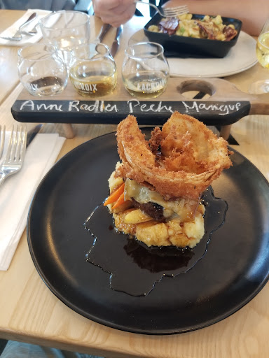Good cider place. Prices are pretty decent. But if you care for a good service in general i strongly suggest going elsewhere. Brunch ends at 2pm, we had a reservation Saturday oct 5 at 2:30pm, we couldn't brunch. Our fault, it said it on the menu. But as soon as we got there, we were placed on a table of 6 next to the big terrasse door and there was constant wind from the huge door. Like a cold fan blowing on you constantly. We asked to be changed tables as 2 other tables of 6 were empty and we were told ''no'' and that it was reserved for the 5pm service (mind you it was 2:30pm). The hostess just looked at us making us understand there's not much she can do, despite half the restaurant being empty. We tried to switched tables and someone from our group asked again to switch tables. She said they will keep the terrasse door closed and waiters will use the back door. That wasn't respected either, they kept opening and closing it. The cider took 45 min to arrive. We were told from the beginning we had our table for 1:45h (meh..) because of the 5pm service (again). They forgot our main course and 2h later we asked about it, and they said they mixed it up and put it for the 5pm service. They put a rush on it... but yea. There's a lack of workforce at it shows. Try maybe going at 5pm, maybe you will get a better service since we all sense an hyper fixation with that time service. Mind you the other tables of 6 remained empty the entire time we lunched. I feel like they hired very young people, that truly have no interest than just showing up. We won't go again. Too bad cause that place has so...