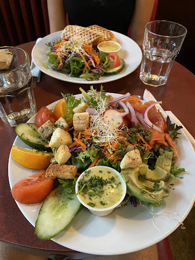 Unfortunately this will have to be my official worst review I’ve written This place has a old artistic approach wich sort of works out,but they don’t wash the walls years after year and they haven’t painted the place since forever,so it doesn’t feeel super clean,chandelier is gorgeous but full of dust and webs,dead bees and dried up Flies on it. However the food is fine and the coffee is good. The lighting is dull and outdated Every time I’ve walked in I’ve always felt the need to sit by the windows,why? Because it gets dirtier and darker as you keep going away from the daylight or the front part of the coffee shop it sort of feels like a library with lights turned off it’s dark,the oldish decors and the unbalanced tables,all different shapes and all different chairs kinda place . Old floor so you tend to always wanna fix or adjust the table so that your coffee or glass water will not Tumble and fall unto another client,so when you get up you have to look 360 or your elbow might hit your neighbours head !