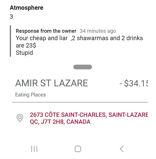 Read moreGot it delivered to my house with the promise they would take 45m MAXIMUM. When the food arrived it had been 75m and the food was cold and the pita bread was soggy. So, I then proceeded to call amir and explain to them the situation and asked politely for a credit of some sort to make up for the lateness, coldness and sogginess of the food. The man on the phone started to argue with me and kept cutting me off in a rude fashion claiming that "I'm wrong" and "The food wasn't late" (even though I have proof of the time I called and the time I received the food). Finally, he took my number and said the owner will call me in about an hour. That was almost a week ago. Would NOT recommend doing business with Amir St-Lazare. Boustans in Vaudreuil may be the...