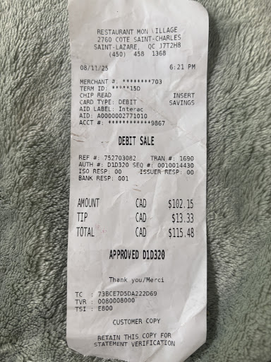 Read moreVERY DISAPPOINTED.$$$$. For a table d'hôte ,it was pricy for what they served. Entré: Spinach salade,feta,strawberry and pecan.It was ok but not wow. Butter was served but no bread.The butter was for what....???? Main course I 've ordered fish which was slightly over cooked.I had the choice of fries,baked potato or smashed potato.I've ordered baked but there was none left so ordered smashed.After two spoon,the rest was fridge cold.The lady took it for warming, it came boiling thus too dry to eat as it was overcooked. Desert.Angel cake with(at least a coulis of Quebec strawberries) and wipped cream. Also not a wow but the coulis was good. Service was just ok not more. Flies on our dishes too bad I can't add a picture as proof. Mon Village for me the first and last visit. Too bad as I like to support local business. Très déçu.$$$$ pour ce qu'on eu pour la table d'hôte et le service. Entrée on a prit une salade d'épinard avec fromage feta,fraise et pacane et c'était correct mais pas un wow. Du beurre était servi mais pas de pain alors le beurre était pourquoi.....???? Plat principale on a prit du poisson qui était un peu sec.On avait le choix entre frite,patate au four ou patate mais il n'en avait plus de patate au four alors je commande patate pillé et après deux bouchées ,le reste était froid glacé.La serveuse l'a reprit pour rechauffer mais trop alors c'était bouillant et trop sec alors pas mangeable. Le dessert gateau au ange et coulis au fraise(du Québec au moins, le coulis était bon) Service très ordinaire en plus il y avait des mouches qui nous embettaient et dommage que je ne peu pas ajouter une photo comme preuve. Mon Village pour moi la première et dernière ....dommage car j'aime bien encourager les commerce locaux. Un...