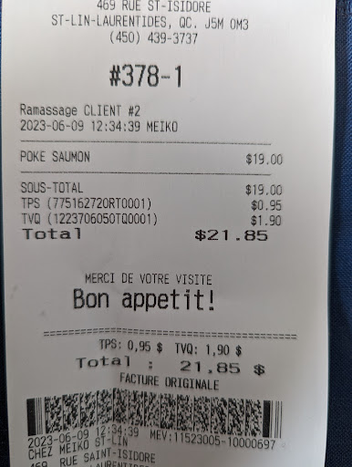 Read moreJe commande chez Meiko st-lin à chaque fois que j’ai envie de sushis ! Pour un resto take-out, les sushis et les autres mets sont vraiment excellent, goûteux, frais, le riz est très tendre et ce, à chaque commande. Je commande par le net, la commande est toujours prêt à temps et les soupes sont bien chaudes et excellentes! Il y a également une attention portée à l’esthétique des...