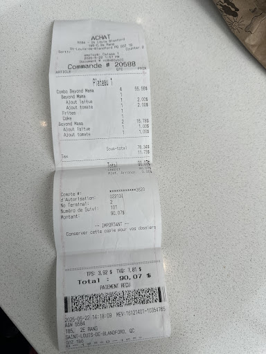 I ordered ( 4 masala veggie burger combo + 2 masala veggie burger ) from this store. Total came to $90.07 which is ridiculous. Cashier charged me for beyond meat burger + added $1 extra for lettuce and tomatoes for each burger. You can see that in the receipt. When I asked about masala veggie burgers , she said they are not on the menu but they have some available. She didn’t warn us about doubled the price of the burgers and started making the order.