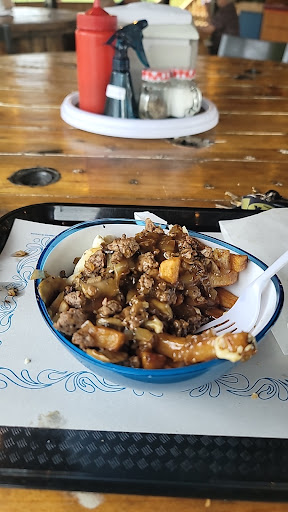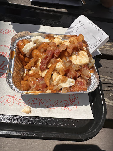 Read moreDeuxième visite en 2 ans : Les portions sont TRÈS CORRECTES compte tenu du prix. À 15$ pour une poutine que je me force un peu pour finir, c'est un juste prix ! (je me force car je n'ai plus faim... ) Le goût est excellent : la sauce est juste assez épaisse, épicée légèrement pour les sortes de poutine que j'ai pu goûter. Le fromage est frais et suffisant. Les frites sont très bonnes également. Par contre le personnel n'est pas souriant. L'an dernier nous avions été servis par un jeune homme sans entrain, et cette année par une dame aux cheveux gris et longues tresses, qui n'avait aucun sourire. L'homme qui crie les numéros pour appeler les clients avait l'ait à boutte de sa journée. Aucun sourire, ni signe de bonne humeur même si on le regarde en lui disant merci et bonne fin de journée. D'après-moi il ne passera pas au travers du Rodéo !