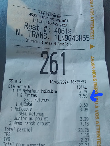 Pour ajouté à ma merveilleuse expérience, je passe la commande à distance d’avance pour qu’elle soit prête à notre arrivé, mon frère et sa femme nous suivent en véhicule eux aussi car désirent manger aussi du Mc-Do, passe au service au volant, arrivé sur place, le commis à la fenêtre me demande d’aller attendre la commande dans la stationnement et je vois mon frère dans le véhicule arrière recevoir leur commande immédiatement alors que ma commande est passé depuis 10 minutes et nous dovons attendre encore un autre 5 à 10 dans le stationnement.